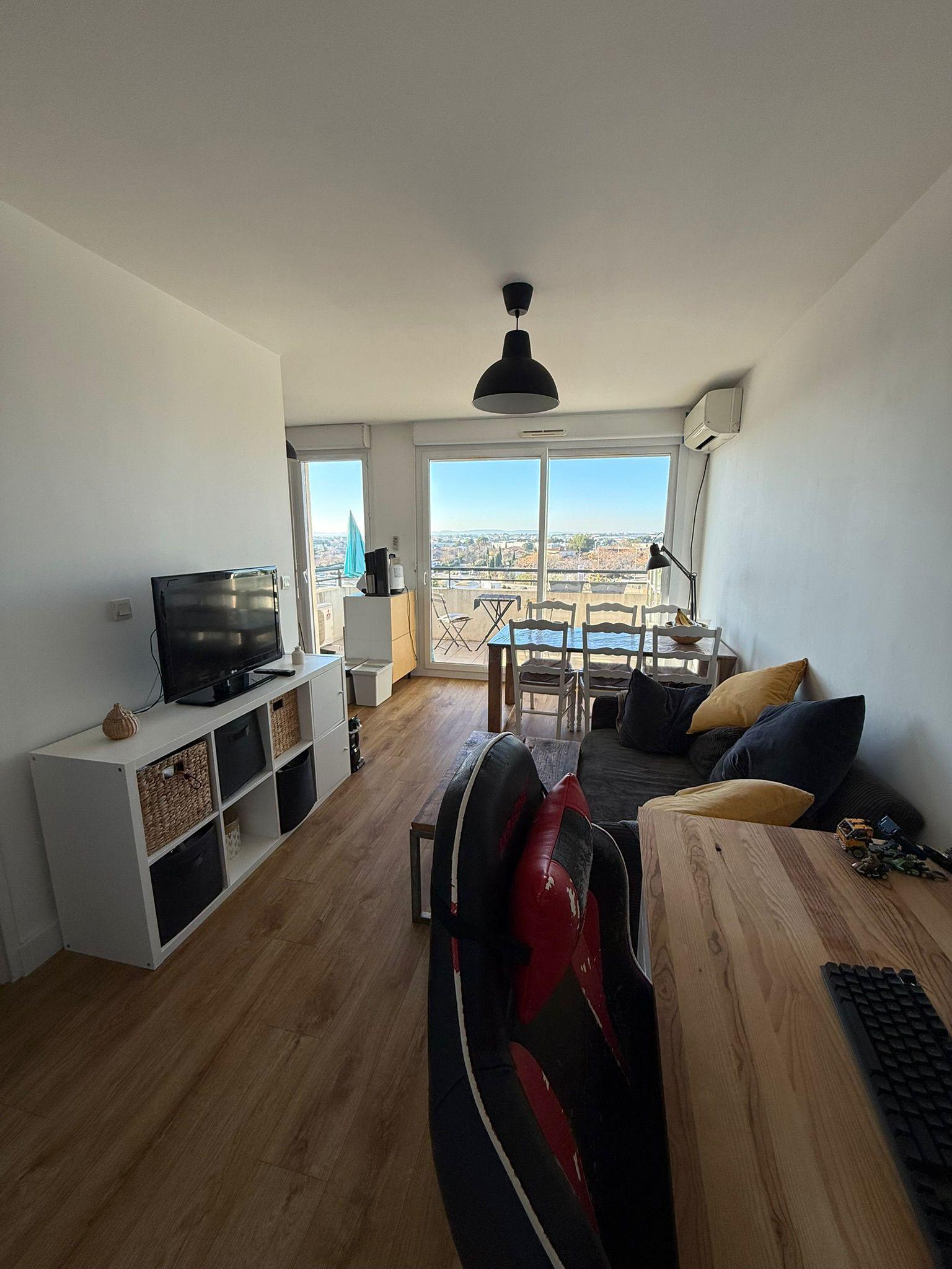Appartement T2 de 38m² composé d'un séjour/salle à manger donnant sur une cuisine ouverte entièrement équipée (réfrigirateur, four micro-onde et lave-vaisselle), d'une salle de bain récemment rénovée en 2025 (équipée d'une machine